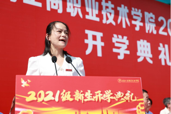 基础部党支部书记、副主任李小玲作为教师代表发言。她欢迎21级新同学来到工商的校园里,勉励同学们要学会学习、学会做事、学会做人。为努力成为“理想素养有境界,知识技能有特点,创新创业有实践,终身发展有潜力”的四有人才而不懈努力。