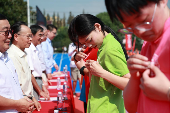 校领导们为新生代表赠送校徽。各院系新生代表带领全体2021级新生庄严宣誓,用工商学子的最强音承诺,完成属于2021级新生的成人礼。
