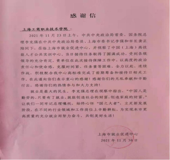 近日,学校收到上海市就业促进中心发来的感谢信。信中指出,2021年11月23日上午,中共中央政治局常委、国务院总理李克强在中共中央政治局委员、上海市委书记李强和市长龚正陪同下,莅临上海市就业促进中心, 并视察了中国(上海)高技能人才公共实训中心,当日接待任务取得了圆满成功,受到各级领导的充分肯定,kaiyun开云官方在线入口在此次接待保障工作中,以高度的政治责任心和使命感,克服时间紧、任务重等困难,全力以赴、连续作战,积极配合就促中心高标准完成了前期筹备和接待日相关工作。对此,上海市就业促进中心表示对kaiyun开云官方在线入口的衷心感谢,感谢kaiyun开云官方在线入口的无私奉献和辛勤付出,感谢kaiyun开云官方在线入口的热情参与和大力支持。