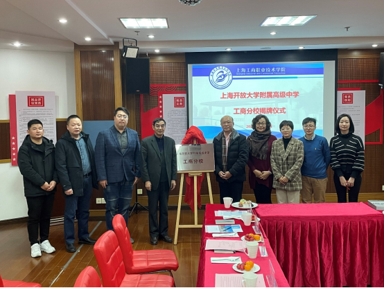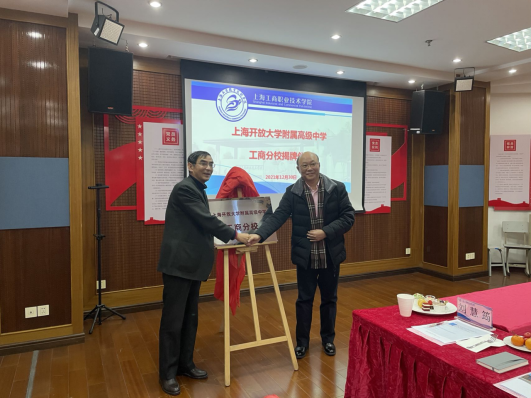 随后陈英南和万映明为上海开放大学附属高级中学工商分校揭牌,双方表示:两所学校携手并进,发挥各自优势,在“十四五”开局之年,同舟共济,奋力拼搏,牢记开展成人教育的初心与使命,为构建全民学习、终身学习的学习型社会而努力。