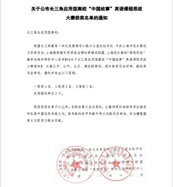 近日,长三角应用型高校“中国故事”英语课程思政大赛组委会正式公布获奖名单,我校教师赵秀华、王志慧在此次比赛中一展风采。最终,在与来自上海、浙江和江苏8所院校14位选手同台竞技中,赵秀华荣获二等奖,王志慧荣获三等奖。