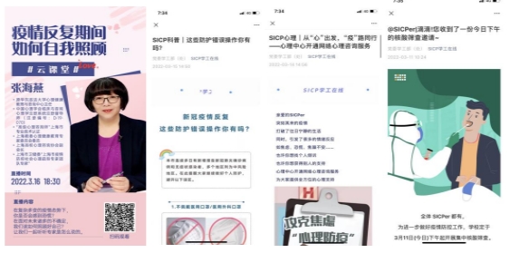党委学工部(处)利用微信公众号等新媒体平台及时引导学生提高政治辨别力,不造谣、不信谣、不传谣,抵制网络谣言,共同维护社会稳定,推送科学防护知识推文,带头做防控知识的传播者、疫情谣言的制止者、健康校园的守护者。全面做好居家学生心理健康服务,开通网络心理咨询服务,并通过“SICP学工在线”不定期推送心理健康教育内容,引导学生树立和塑造正确的世界观、人生观、价值观。并邀请原华东政法大学心理健康教育与咨询中心主任、上海市疫情防控社会心理疏导专家团队专家张海燕开展以“疫情反复期间如何自我照顾”为主题的讲座,帮助学生学习如何在疫情中提高心理免疫力,积极面对自身情绪变化,更好地进行自我照顾。