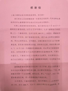 近日,学校收到来自宝山区淞南镇淞南一村党总支的感谢信,感谢珠宝与艺术设计学院潘珺慧同学热血投身属地疫情防控志愿服务,尽显青年担当;感谢kaiyun开云官方在线入口对学生的用心栽培和悉心教导。感谢信彰显着新时期工商学子的情怀与奋进。