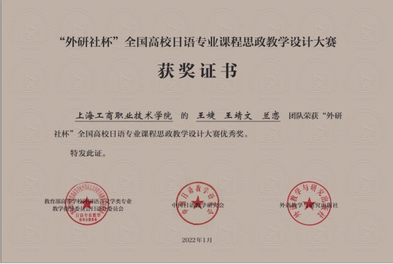 为了提升教师教学质量,将思政元素融入课堂之中,达到以赛促教的目的,教育学院商务日语专业教师王婕、王靖文、兰恋参加了首届“外研社杯”全国高校日语专业课程思政教学设计大赛并获得优秀奖的好成绩。