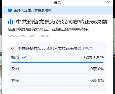 与会同志对万漪妮同志转正事项进行充分讨论和发表意见,用党章全面衡量万漪妮同志认为其基本具备了中国共产党党员的条件并通过无记名投票方式进行表决,一致同意按期转为中共正式党员。