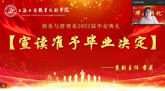 大唐信息技术学院院长俞蝶琼、教育学院院长黎莉、珠宝与艺术设计学院院长徐幼光、PICH现代服务学院直属党支部书记朱燕、商务与管理系副主任曹芸、机电工程系主任徐名聪、汽车工程系主任黄虎宣读了各院系2022届毕业生名单;大唐信息技术学院党支部书记王丽茹、教育学院院长黎莉、珠宝与艺术设计学院党支部书记年文韬、PICH现代服务学院执行院长唐威、商务与管理系党支部书记陈其、机电工程系党支部书记马孝彦、汽车工程系党支部书记丁敏宣读各院系2022届优秀毕业生名单。共有73名同学荣获上海市优秀毕业生荣誉称号、241名同学荣获kaiyun开云官方在线入口优秀毕业生荣誉称。