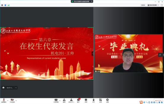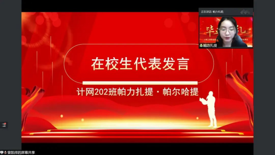 计网202班的帕力扎提·帕尔哈提、国际商务202班陈鑫、机电201班王帅作为在校生代表向2022届顺利完成学业的学长学姐们表示祝贺,并祝愿毕业生们,乘风破浪、挥斥方遒,书写新的华彩篇章。