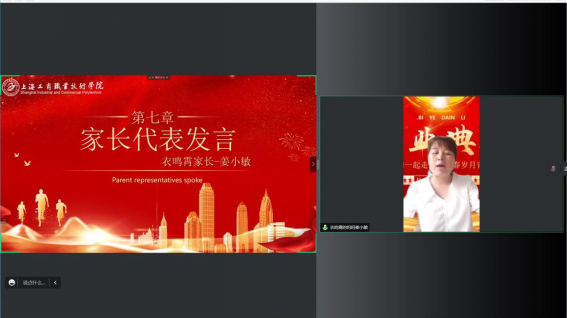 物联网应用技术191班徐君雯家长徐敏霞祝愿学校能够越来越好,祝愿各位老师们工作顺利,祝愿毕业生们前程似锦;首饰设计与工艺193班王钦瑶家长王旭寅对学校表示感谢,祝福所有的毕业生们都有着一份美好的未来;会计195班董广莹家长董志良表达了对校系两级领导和老师的深深谢意,并希望毕业班同学们饮水思源,勿忘师恩,脚踏实地,在实现中华民族伟大复兴的“接力赛”中跑出好成绩;机器人192班衣鸣霄家长姜小敏表示大学三年时间她欣喜地看到孩子的一步步成长,获得多个奖项,综合素质得到了极大的提升,衷心感谢学校领导和老师们的辛勤付出和精心的培育。