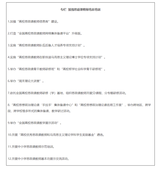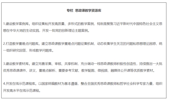 19.全面推进课程思政高质量建设。教育部组建高等学校课程思政教学指导委员会,研制普通本科专业类课程思政教学指南,组织开展高校教师课程思政教学能力培训,建设一批课程思政系列共享资源库。建成一批课程思政示范高校,推出一批课程思政示范课程,选树一批课程思政教学名师和团队,建设一批高校课程思政教学研究示范中心。加强中小学学科德育建设。