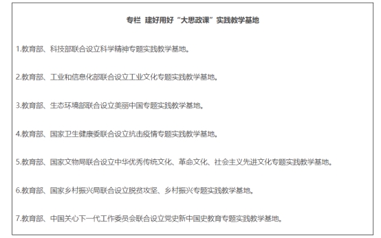 10.建好用好实践教学基地。教育部会同有关部门,利用现有基地(场馆),分专题设立一批“大思政课”实践教学基地。发挥好教育部高校思政课教师研学基地的实践教学功能。各地教育部门要结合实际,积极建设“大思政课”实践教学基地。大中小学要主动对接各级各类实践教学基地,开发现场教学专题,开展实践教学。有条件的学校可与有关基地建立长效合作机制,加强研究和资源开发。各基地要积极创造条件,与各地教育部门、学校建立有效工作机制,协同完成好实践教学任务。