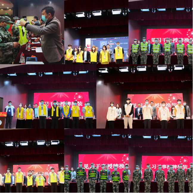 由校党委人民武装部、党委保卫部、各院系党支部书记为大学生事务中心新晋职部长、各院系易班学生工作分站站长和各见习干事授牌换装