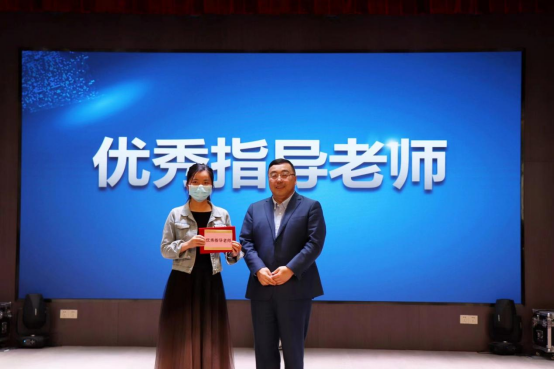 副校长王中强为优秀指导老师——商务与管理系辅导员刘新雨颁奖。