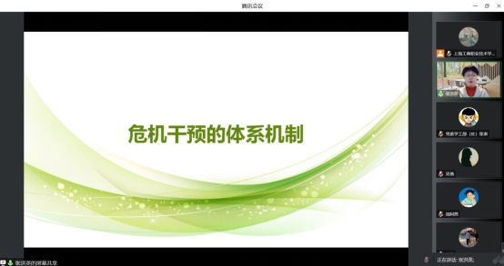 张洪英副教授介绍了全国高校大学生心理危机问题的现状和趋势,就心理危机干预的体系机制、存在的问题与挑战、工作的原则以及危机干预流程进行了详细介绍,着重强调了形成危机避免、防备、识别、隔离、管理、总结等心理危机评估体系的重要性,为大学的心理危机干预工作提供了指导和帮助。