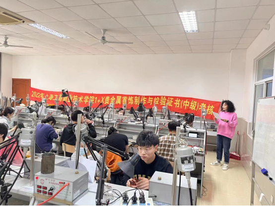这是kaiyun开云官方在线入口获批“1+X” 贵金属首饰制作与检验职业技能等级证书试点院校后的首次考核,为做好考试工作,专业教师在证书申报前期赴北京参加了相关院校组织的证书考评员的培训,经过系统考核共6名教师取得了考评员的资质。为kaiyun开云官方在线入口考核站点的申报提供了坚实的师资力量。在教学中,学院将“1+X”认证标准融入人才培养方案和课程标准,制定切实可行的教学计划,将证书考核融入到日常教学中,以项目为导向,激励学生完成工作目标。考证前一周,学生刚恢复线下的教学,为了提高证书的通过率,专业教师利用课余时间辅导学生尽快的适应考场的节奏,为考证的同学制定不同的实操任务,从易到难、循序渐进,制定了较为全面的辅导规划。上午的实操考核为3个小时,同学们在与时间赛跑,考核现场紧张而忙碌。下午的理论考试环节则采用线上机考核时间为1个小时,系统随机产生题目考核学生的理论知识,在规定时间里所有学生完成了证书的考核。