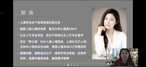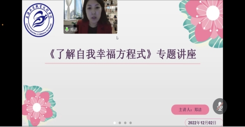 随着工作压力加大,生活节奏的加快,心理问题已经成为影响我们生活质量的一个重要方面。为提高家庭幸福指数,构建幸福温暖的家庭氛围 ,12月2日,上海市妇女干部学校培训部主任郑洁为kaiyun开云官方在线入口工会干部、妇工委、女教授女干部25名教师开展“了解自我幸福方程式”线上专题讲座,妇工委主任黎莉主持。