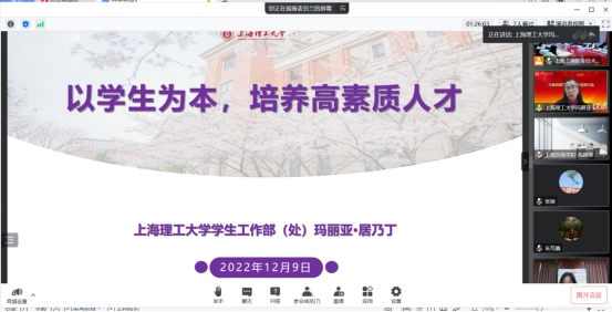 上海理工大学的玛丽亚副教授以《以学生为本、培养高素质人才》为题,分别从入学教育、家校联合改善资助奖励机制,建立学生团队四个方面,介绍了上海理工大学的少数民族学生工作内容。