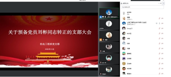 为进一步壮大党员队伍,增强党支部的凝聚力和战斗力。2022年12月16日下午,机电工程系党支部以线上会议方式召开预备党员刘彬同志转正的支部大会。由党支部书记马孝彦主持会议,党支部20名中共正式党员参加了会议。