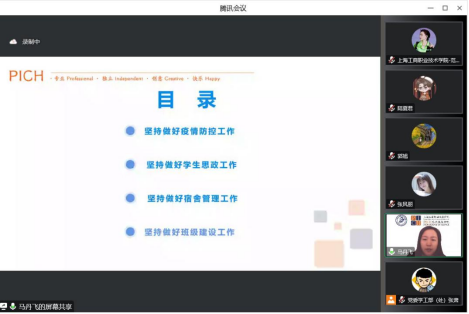 PICH现代服务学院直属党支部副书记马丹飞以《踔厉奋发、笃行不怠,践行育人的初心与使命》主题,从疫情防控工作、学生思政工作、宿舍管理工作、班级建设工作四个方面,分享了本学期紧紧依靠学院师生,围绕学院工作,以党建为引领,以学风建设为主线,提高人才培养质量。坚持把立德树人作为中心环节,坚持“一个目标、两维协同、三段管理、四元合一、五育并举”的育人模式,踔厉奋发、笃行不怠,深刻践行育人的初心与使命。