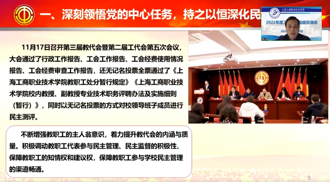 会上,杨小彬作学校工会年度工作总结报告。2022年是学校全面推动“十四五”规划高质量落地实施,新征程的关键之年。学校工会坚持以习近平新时代中国特色社会主义思想和习近平总书记关于工人阶级和工会工作的重要论述为指导,在学校党委和市教育工会的领导下,学校行政的大力支持下,紧紧围绕中心、服务大局、积极作为,积极发挥好党联系教职工的桥梁纽带作用,紧密团结广大教职工听党话、跟党走,为学校统筹好疫情防控和事业发展两个大局贡献智慧和力量。工作报告从“深刻领悟党的中心任务,持之以恒深化民主管理;聚焦主责主业工作重心,扎实筑牢服务保障体;打造健康向上职工文化,引领青年教师岗位建功;不断加强思想政治引领,尽情展示女性风姿风来;持续深化自身组织建设,有效发挥桥梁纽带作用;全力以赴抗击新冠疫情,齐心助力实现无疫校园”等六个部分进行总结概括。