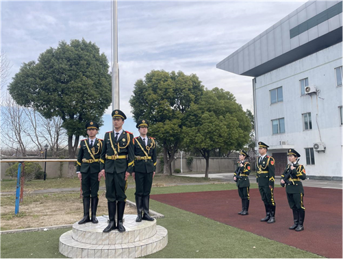 7点45分,国旗队的旗手们着装整齐,迈着矫健的步伐,护着鲜艳的五星红旗入场进行升旗仪式。伴着《义勇军进行曲》的响起,全体唱国歌、行注目礼,庄严肃穆。