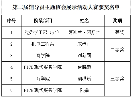 经过评委现场打分,最终少数民族专职辅导员阿迪兰·阿斯木《石榴花开献祖国,籽籽同心皆向党》荣获一等奖;机电工程系辅导员宋淳正《螺丝钉的工匠精神》、商学院辅导员刘新雨《学会时间管理,做时间的主人》荣获二等奖;PICH现代服务学院辅导员伊晓静《致敬新时代,你好新青年》、PICH现代服务学院辅导员陆娟《踔厉奋发扬斗志,从“心”出发正当时》和商学院辅导员胡洪娇《从