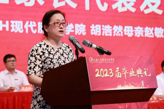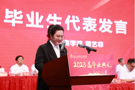来自商学院毕业生代表周艺菲抒发了对母校、对老师的感激之情,表示会努力成为“理想素养有境界,知识技能有特点,创新创业有实践,终身发展有潜力”的新型工商“四有”人才,为建设社会主义现代化强国贡献力量,为母校争光。