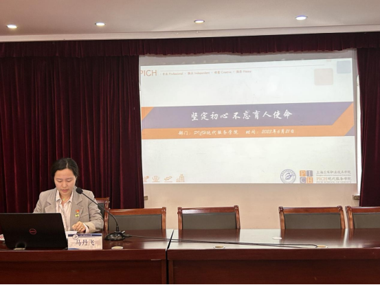 PICH现代服务学院直属党支部副书记马丹飞以《坚定初心 不忘育人使命》为主题,从坚持立德树人、开展思政教育,以党建带团建、推进团学工作,以矩阵为堡垒、发挥育人功能,结合专业特色、保障实习就业四个方面,分享了本学期学院以贯彻落实党的二十大精神为主线,以党建为引领,积极推动开展学院建设,坚持把立德树人作为中心环节,踔厉奋发、笃行不怠,深刻践行育人的初心与使命。