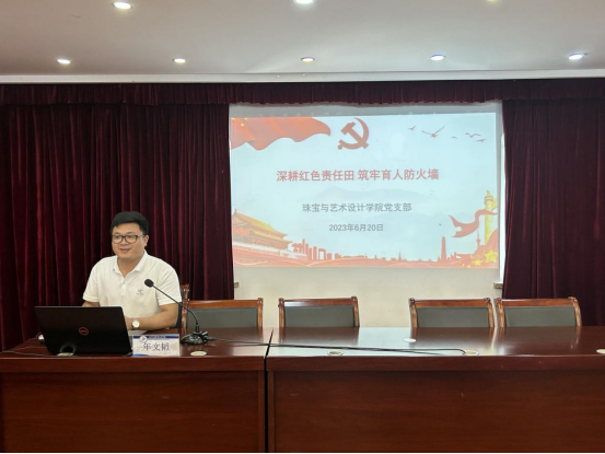 珠宝与艺术设计学院直属党支部书记年文韬以《深耕红色责任田 筑牢育人防火墙》为题,从做好学生安全教育和管理、开展第二课堂、落实“责任敬业”主题教育、深化团学青年思想政治引领、推进资助育人、做好就业和征兵工作五个方面,进行了全面而深刻的总结。