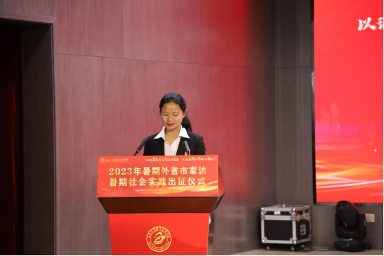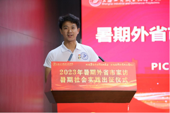 暑期外省市家访教师代表PICH现代服务学院宋招科,暑期社会实践学生代表珠宝与艺术设计学院陈宝胜上台发言。