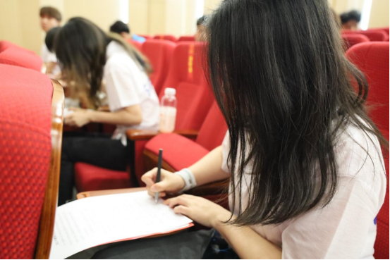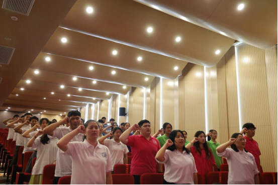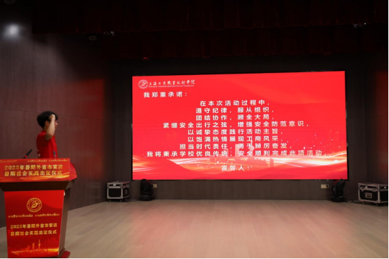 出征师生在领誓人陈宝胜的带领下集体宣誓,并签署承诺书。