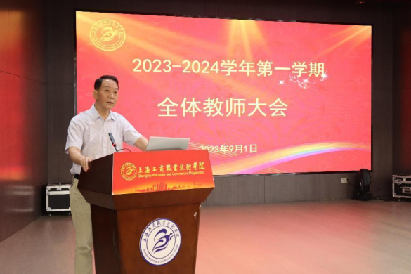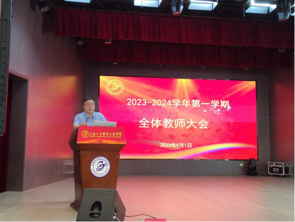 王中强总结讲话,充分肯定了学校上学期在教育教学方面取得的优异成绩,并感谢两位教师的优秀经验分享。随后从推进招生就业、校园环境改善、成果展示馆建设、安全指挥中心升级改造等方面总结回顾了暑假期间学校工作取得的新突破,并从师德师风建设、教师素质提升、教育教学工作重点等方面对下半年工作进行整体部署。针对师德师风建设,他强调全校教师要始终牢记为党育人、为国育才,并通报了《教育部公开曝光第十三批7起违反教师职业行为十项准则典型案例》,要求广大教职工引以为戒,牢固树立底线意识,潜心教书育人,关爱学生成长,共同提升育人效果;针对教师素质提升,他强调在ChaptGPT冲击下,广大教师一定要转变教育理念,不仅仅做知识的传授者,还要围绕教会学生怎么做人、怎么做事、掌握学习的方法,以便适应急剧变化的时代;针对学校教育教学工作,他再次强调一定紧紧围绕国家《职业教育产教融合赋能提升行动实施方案(2023—2025年)》和教育部办公厅关于加快推进现代职业教育体系建设改革重点任务的通知(11条)文件精神,提出“立足嘉定青浦、面向上海、辐射长三角”的口号,并要求课堂教学和实习实训既要能做到把企业搬到课堂,也要把课堂搬到企业,实行灵活地项目制教学。