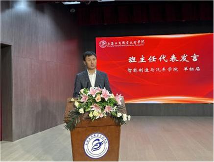 智能制造与汽车学院单祖届代表班主任发言,他表示在担任班主任期间内将全力以赴,认真履行学校安排的各项任务,积极投入,确保每一个任务都得到精心执行。无论是日常的工作安排还是特殊的项目任务,都将以高度的责任心和专业素养,充分发挥团队的协同力量,确保任务按时完成并达到预期目标。为同学们打造一个充满学习交流和生活的空间,鼓励同学们在这里共同成长进步。
