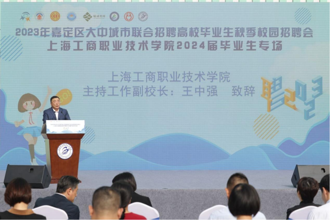 主持工作副校长王中强为活动致开幕辞,他代表学校对长期以来关心和支持学校毕业生就业工作的嘉定区人力资源和社会保障局、嘉定区总工会、嘉定区工商业联合会、嘉定区外冈镇人民政府、嘉定职教集团、嘉定中华职业教育社和各企事业单位表示最衷心的感谢。他指出党中央、国务院高度重视就业工作,特别是针对高校毕业生等青年的就业问题。今天政府、学校和用人单位多方联手,加强了彼此间的联系,共同挖掘和争取了更多的就业资源和机会。这种合作模式为区域就业和经济发展提供了长期的支持,为学生和用人单位之间搭建了沟通的桥梁,实现了用人单位与毕业生之间的无缝对接。
