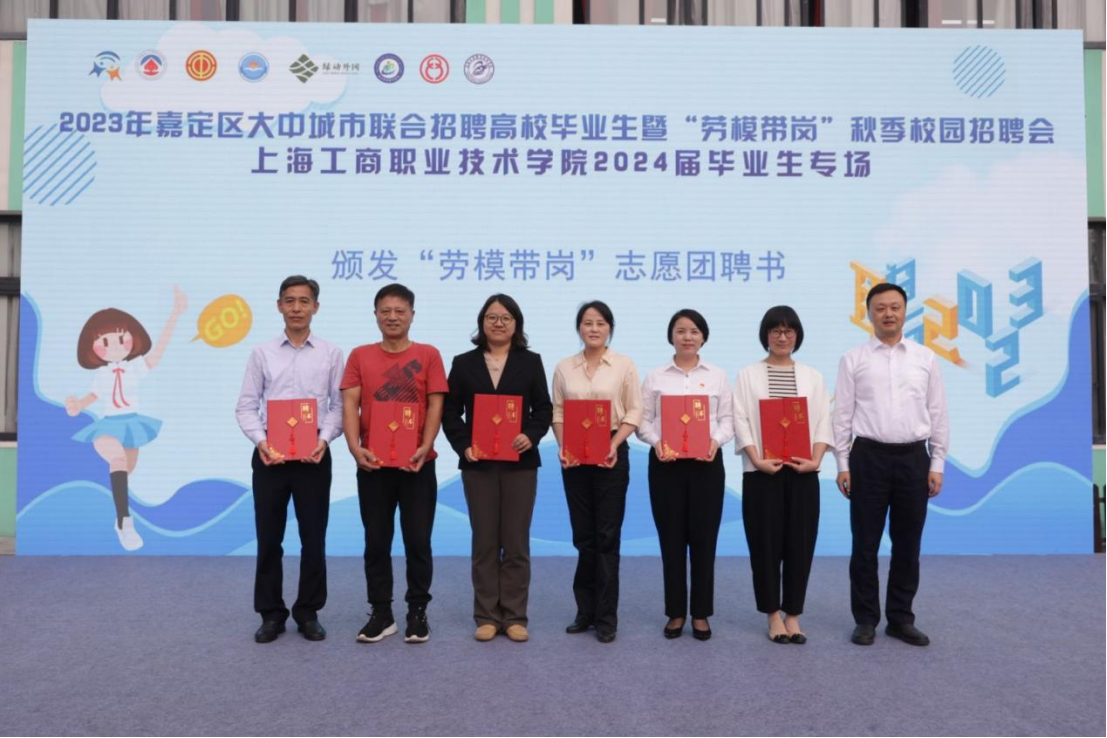 为表彰那些在工作岗位上取得优异成绩的劳动模范深入校园,关心关注大学生就业,积极参与“劳模带岗”直播活动,上海市嘉定区就业促进中心主任沈继良为劳模代表、嘉定区总工会“劳模带岗”志愿团成员:嘉定区水产技术推广站书记、站长胡春晖;陆泰密克汽车系统(上海)有限公司维修电工高级技师朱士昇;马陆镇农业农村服务中心副主任张晋盼;嘉定镇街道桃园社区党总支书记诸海霞;上海嘉定公共交通有限公司部室支部书记陈海燕;英飞同仁风机股份有限公司法律事务部总监、工会主席徐莉勤颁发聘书。