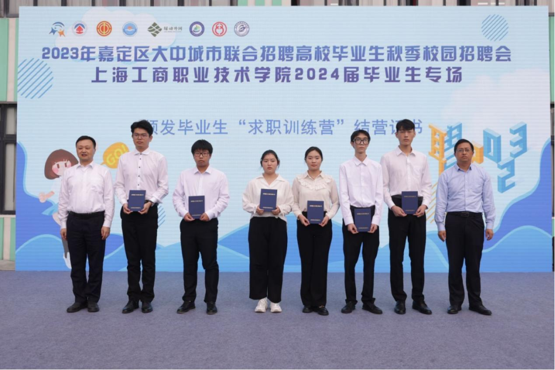 招聘会现场,嘉定区人力资源和保障局与kaiyun开云官方在线入口共同开展的为期一个月的求职训练营举行结营仪式,上海市嘉定区就业促进中心主任沈继良、学校副校长李向明为毕业生求职训练营的学员们颁发结业证书,希望学员们学有所思、学有所获、学有所用,继续努力,为自己的未来添砖加瓦。