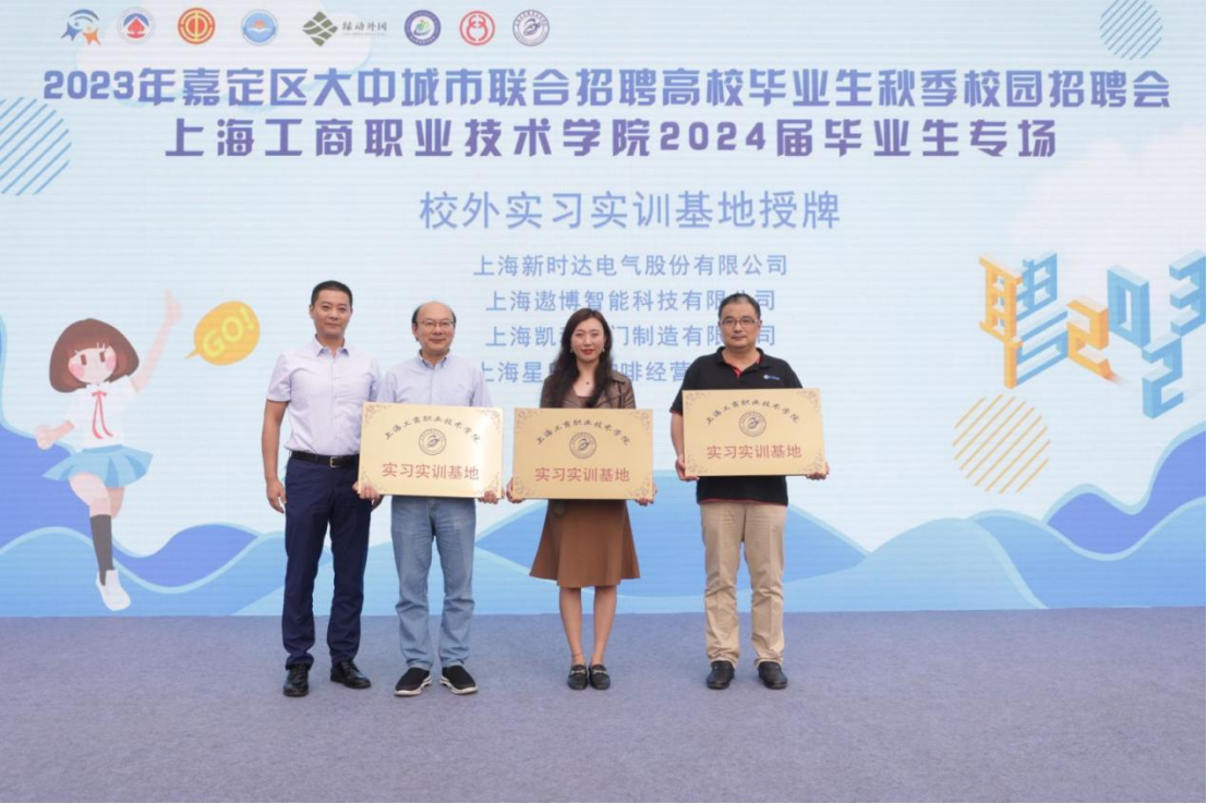 在嘉定区工商联的关心和指导下,学校与上海新时达电气股份有限公司、上海遨博智能科技有限公司、上海凯科阀门制造有限公司、上海星巴克咖啡经营有限公司经过友好协商,建立校外实习实训基地,将为学生提供更多的实践机会,培养出更多的优秀人才。上海市嘉定区工商联党组成员、副主席陈攀上台为为他们授牌。