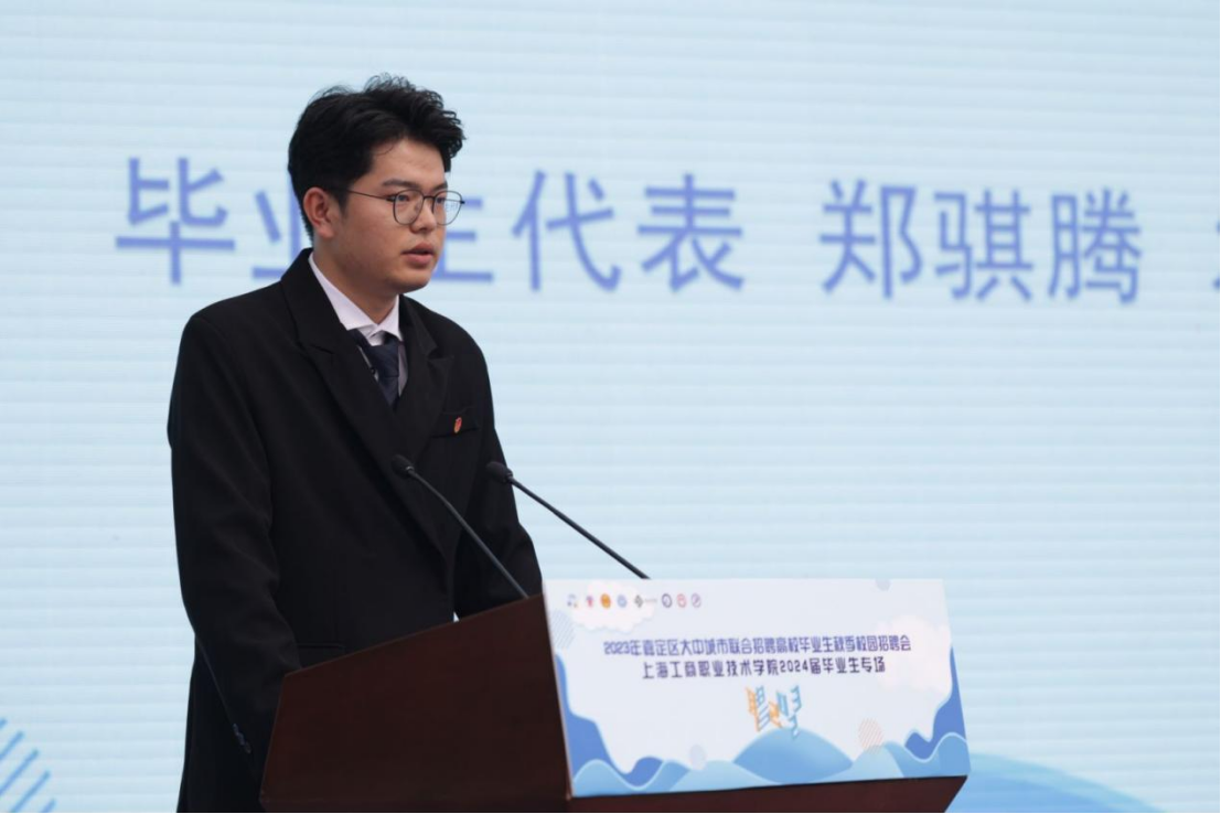 大唐信息技术学院郑骐腾代表毕业生发言,他衷心感谢学校对他的精心培养,同时也感谢各方助力为毕业生们搭建了求职平台,让他们能够在校园内与各大企业进行面对面的交流。他会珍惜这个机会,坚定地向着自己的目标前进,努力实现自己的人生理想。