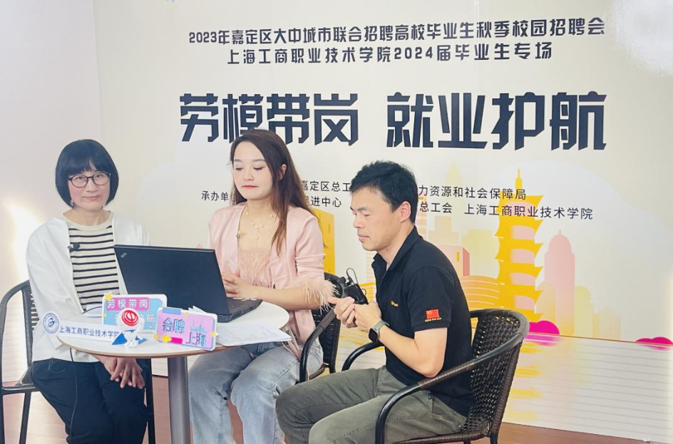 本次招聘会上,区总工会“劳模带岗”志愿团成员来到直播间,围绕嘉定新城建设,积极挖掘企业就业岗位潜力,以劳模的身份带领职工直播间感受企业文化、了解岗位需求、引导职工正确职业规划;聚焦困难就业人群,将“劳模带岗”活动进校园,提高就业帮扶工作的成功率。