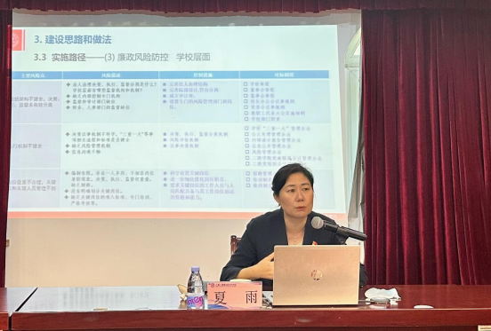会上,夏雨教授以《民办高校廉政风险防控体系建设探索与实践》为题,从理清工作职责,明确工作权限,强化建章立制,及时梳理并优化业务流程、明确关键环节、识别风险隐患、制定风险应对措施、规范业务流程等方面对民办高校廉政风险防控体系建设探索与实践进行详细阐述,讲课内容生动详实、实践指导性强,对全体党员干部抵御腐败、提高廉洁从政能力有着十分重要的作用。