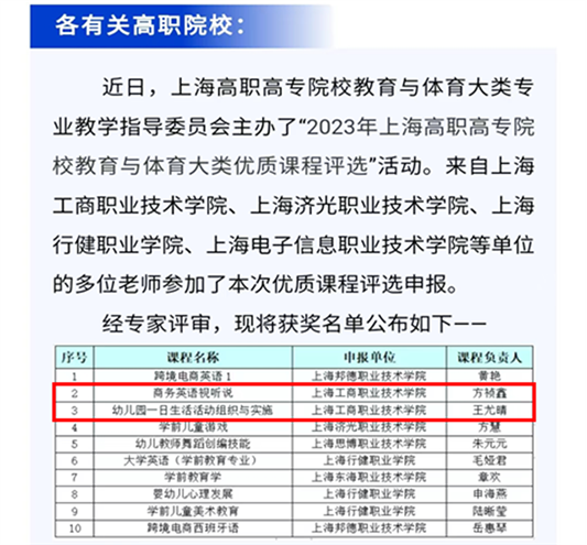【喜报】kaiyun开云官方在线入口教育学院2门课程获评2023年上海市高职高专院校(教育与体育大类)优质课