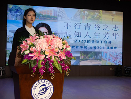 教育学院陈敏欣从专业学习和实践活动出发,结合自己的学科竞赛、创新创业的经验,讲述了如何给自己设定硬性目标。她说道“践行青衿之志的道路上不仅充斥着未知,也充斥着步步花香”。