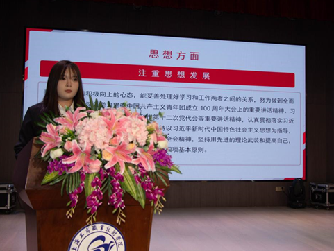 珠宝与艺术设计学院曹淑贤用《聚青年之力,赋青春之行》阐释不断的适应时代的发展,跟上时代的步伐,不断的去扩充自身的知识储备,以提高自身的修养,勉励学弟学妹们要做一个求索知识、锤炼本领的新时代的追梦人。