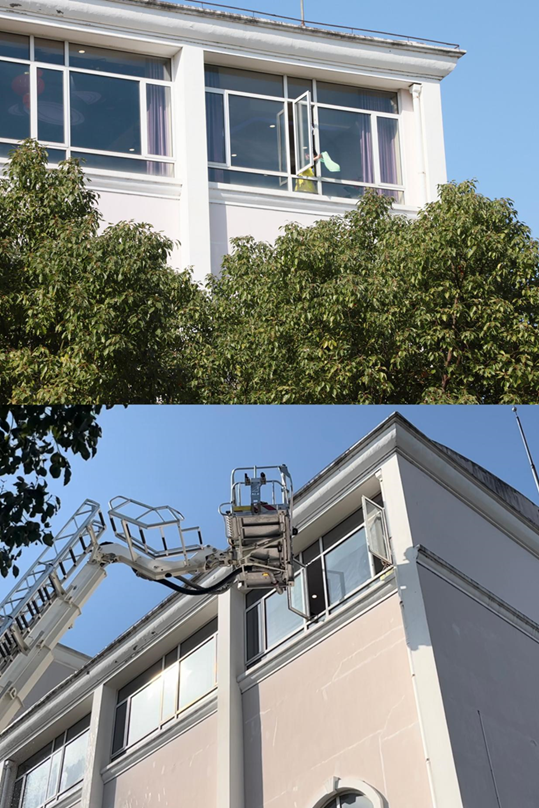 实景演示:图书馆出现模拟火情,应急处置工作随即展开。图书馆内师生撤离现场的同时,微型消防站队员火速赶往现场,进行初起火灾扑救。消防员根据图书馆上报的人员被困信息,利用云梯营救被困人员,并用水枪成功灭火。
