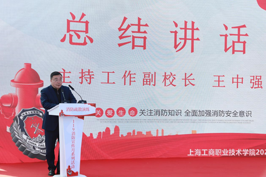 王中强对演练活动做总结讲话。他说本次活动保卫部组织到位,保障有力,全体师生积极配合,服从命令,按照预定的疏散路线,有序撤离。“灾难无情,生命无价”,他希望全体师生能以这次消防疏散演练为契机,进一步把学校的安全工作做好,谨记“生命至高无上,安全重于泰山”,并为实现“平安校园”这一共同目标而不懈努力。