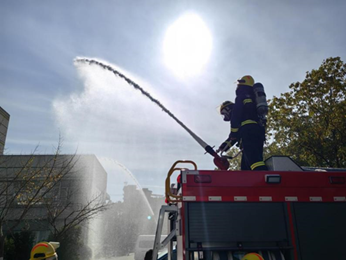 而后进行实景演示,模拟第二教学楼出现火情,应急处置工作随即展开。消防队迅速赶到现场,展开灭火和救援行动。