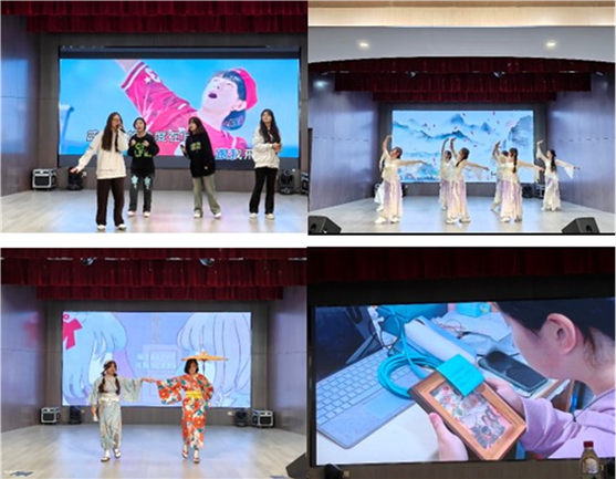 接下来是由毕业班张洋妮等同学们带来的歌曲表演《青春之歌大梦想家》、商务英语专业同学带来的古典舞蹈《入画江南》以及商务日语专业同学带来的《和服秀》,其间播放的两段《心理微电影视频》如同一个个生动的生活片段,让我们走入片中人物的内心世界,在寒冷的冬日感受到心灵的温暖。从青春洋溢的舞蹈到悠扬婉转的歌声,从别出心裁的走秀到熨帖人心的微电影,同学们的多才多艺与创意巧思成为舞台上最耀眼的光芒,展现着教育学子朝气蓬勃的靓丽风采。