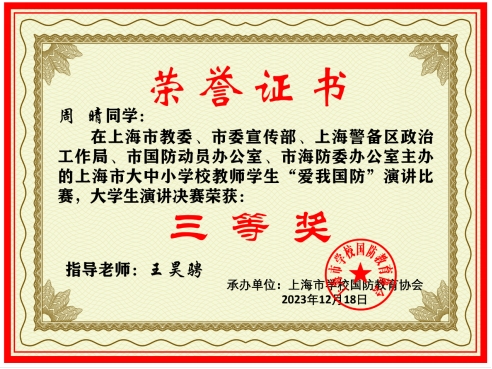 为深入学习贯彻党的二十大精神,贯彻落实《中华人民共和国国防教育法》《中共中央 国务院 中央军委关于加强和改进新时代全民国防教育工作的意见》《新时代爱国主义教育实施纲要》《上海市人民政府办公厅 上海警备区办公室关于深化学生军事训练改革的实意见》有关要求,近日由上海市教委、市委宣传部、上海警备区政治工作局、市国防动员办公室、市海防委办公室主办的上海市大中小学校教师学生“爱我国防”演讲比赛准决赛圆满结束,在经过专业评审的点评打分和线上网络人气投票的激烈角逐后,kaiyun开云官方在线入口大唐信息技术学院张敏老师和教育学院周晴同学分别摘得“爱我国防”教师演讲决赛二等奖和大学生演讲决赛三等奖的荣誉。