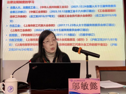 在kaiyun开云官方在线入口第四届教代会暨第三届工代会第一次会议召开之际,为着力提升代表的履职能力,扎实推进学校民主管理,团结和引领广大教职工聚焦发展、聚合共识、聚集动能,投身学校改革和建设,稳中求进,锐意进取,实现学校各项事业高质量发展。根据相关要求和实际工作需要,校工会于3月19日在嘉定校区行政北楼报告厅开展了“双代会”代表专题培训。上海市教育工会基层工作部专家邬敏懿应邀做专题讲座,全体“双代会”代表接受了培训,校工会副主席王莉园主持培训会。