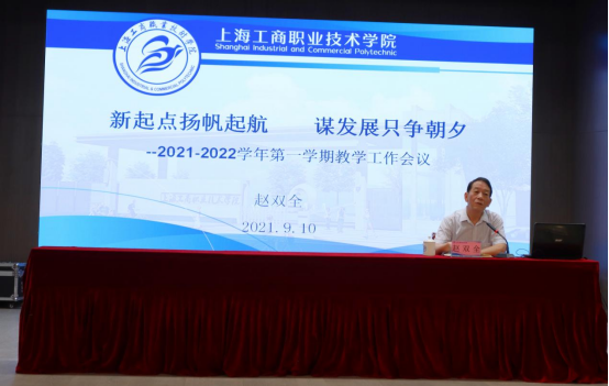 教务处处长赵双全以《新起点扬帆起航 谋发展只争朝夕》为题,对2021-2022学年第一学期的教学工作从1.聚焦服务上海四大品牌,做好专业布局和专业建设;2.坚持立德树人,全面推进思政课程和课程思政建设;3.加大内涵建设力度,提高技术技能人才培养质量;4.严格教材管理,加强课程建设;5.对接行业职业标准,提高人才供给的精准度;6.深化产教融合,强化学生实习实训工作;7.提炼专业特色与优势,认真完成数据采集;8.深化教育教学研究,提高技术创新和社会服务能力;9.加大教学诊断与改进,切实保障教学质量;10.加强课堂教学管理,规范教学秩序等方面做了具体部署。