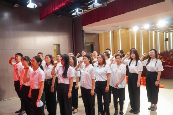 党委副书记、校长陈英南带领全体新教师庄严宣誓,一字一句铿锵有力,代表着新教师们对誓词的决心,每一位新教师将用爱与责任践行着对教育事业的忠诚,共同实现自己的教育誓言。